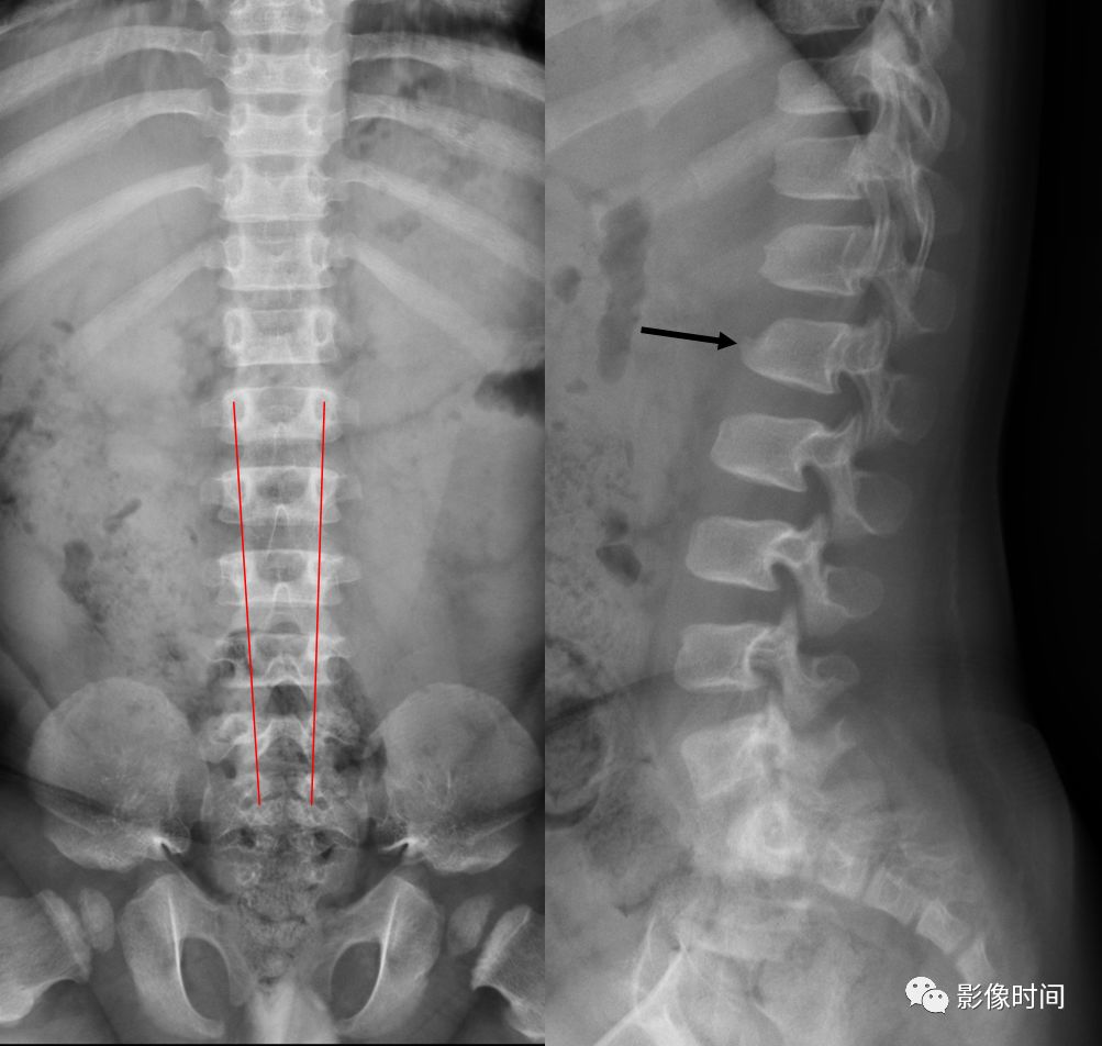 病例 2,2 岁男孩,软骨发育不全。腰椎侧位片可见椎体呈子弹形(黑箭),另外还可以见到椎体后缘扇贝样凹陷,正位片课件典型的腰椎弓根间距逐渐缩小(红线)。
