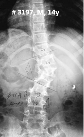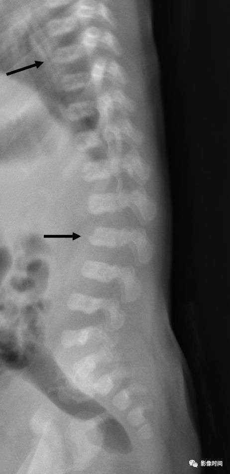 图. 男性,14岁,X线下典型的椎体扇贝样改变