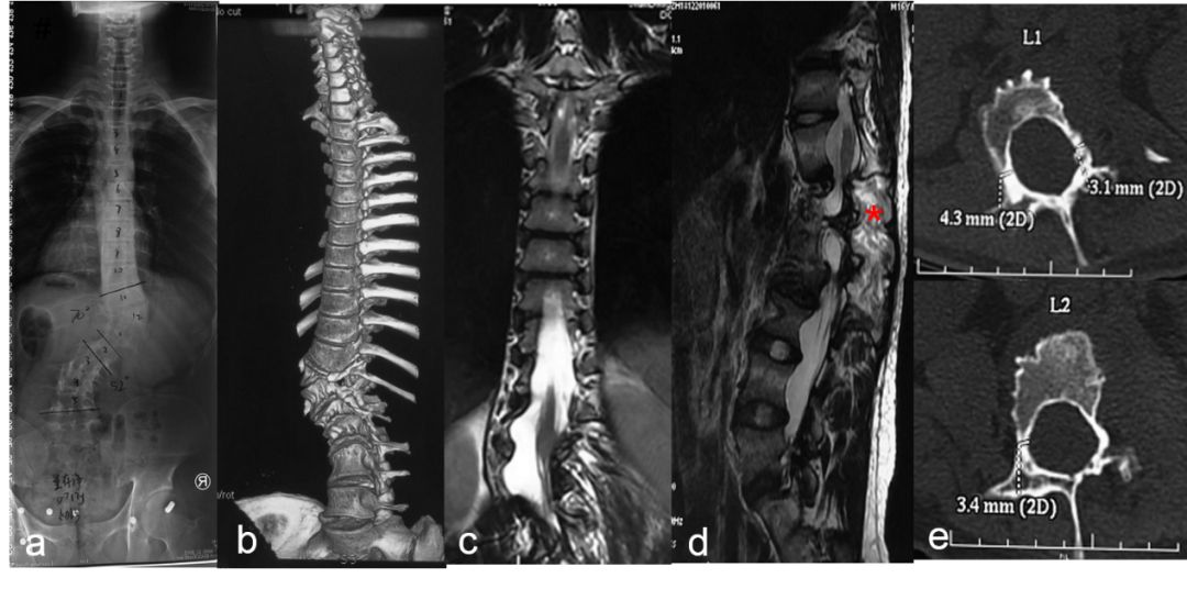 图. 男性,7岁,NF1伴脊柱侧凸;X线示腰椎侧凸畸形(a), CT示椎体及椎板椎弓根破坏,椎管扩大(b、c);MRI示椎管扩张,椎旁肿瘤(c、d);CT横断面示椎弓根发育不良,椎体边缘破坏(e)