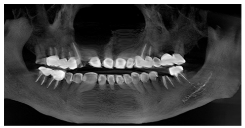临床检查:36大面积缺损,牙体缺损至龈下2~3mm,根管口可见牙胶样材料,黏膜未见红肿及窦道;37冠修复,叩诊无不适,根尖部无牙龈红肿,扪诊无不适,左侧下唇无麻木不适;12缺失;11、14-16、21-27、31-35、41-47冠修复。
