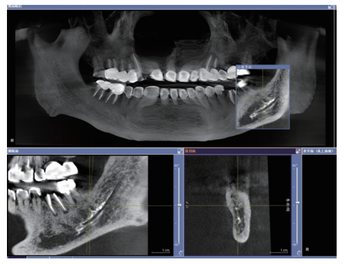 本病例中大量根管充填材料也是经左下颌第二磨牙根尖被挤压进入到下颌管内。如果使用CBCT扫描、重建多平面图像进行术前评估,就可以三维清晰地展示解剖结构之间的关系,降低根管治疗过程中损伤下牙槽神经的风险。