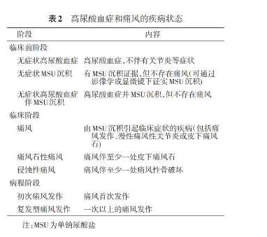 痛风属于代谢性疾病,由于尿酸盐结晶沉积于关节、软组织和肾脏,引起关节炎、皮肤病变及肾脏损害等。调查发现,约1/3的高尿酸血症患者发展为痛风,我国高尿酸血症患病率约为13.3%。高尿酸血症和痛风是同一疾病的不同状态。近期针对高尿酸血症和痛风的不同疾病状态进行新的定义,根据疾病进展和表现分为3个阶段、8个状态(不同疾病状态可同时出现),见表2