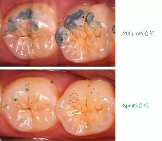 图5 200µm和8µm咬合纸印迹的对比,注意图中红圈标记的位置