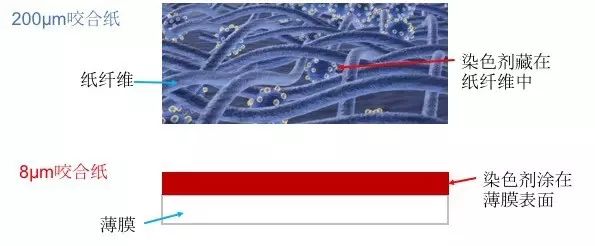 1.两种咬合纸制作的差异,导致了染色原理的差异,如下图: