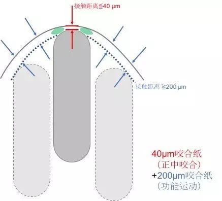 只要有咬合纸的印迹,接触距离小于该咬合纸的厚度。(图1)