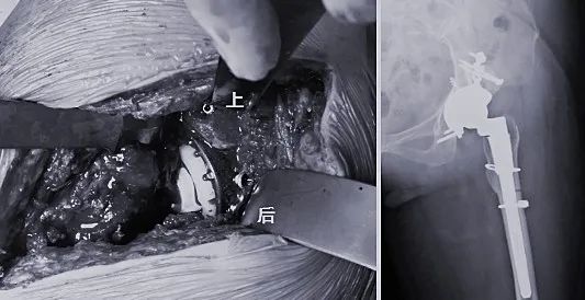 髋臼后壁缺失,无法稳定夹持臼杯,利用自体骨和钢板重建髋臼后上方及后壁