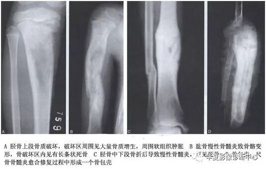 骨质增生硬化:表现为局部的骨质密度增高,皮质增厚变形,局部骨小梁的增多、增粗,骨髓腔狭窄、甚至消失或形成骨赘。