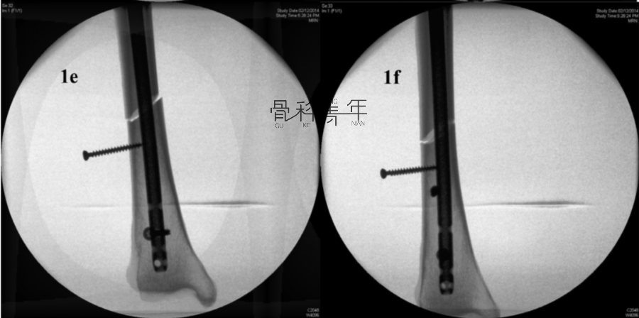 1e-1f:在松质骨螺钉置入后,可见端骨折端移位纠正,对线良好,复位后置入阻挡钉,维持复位。
