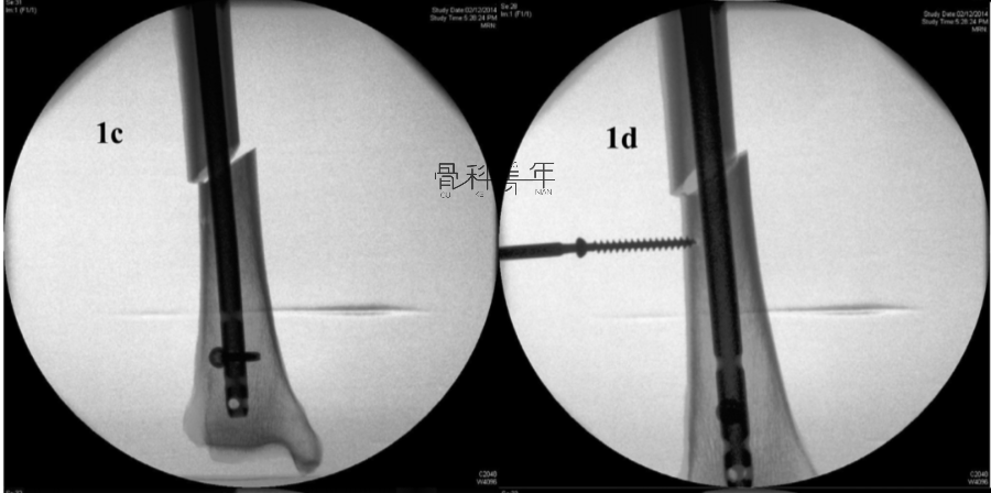 1c-1d:在骨折端成角平面,即冠状面上,拟置入阻挡螺钉部位近端钻孔,拧入松质骨螺钉,推动骨皮质与主钉移位,纠正侧方移位。