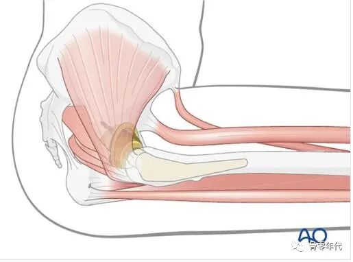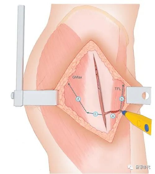 使用支架将髋部20度外展。撕裂和回缩的臀中肌腱通过去除粘连进行识别和松动。现有的臀中肌和臀小肌腱尽可能直接修复到大转子上,通过跨骨隧道用两条不可吸收的八字形缝线缝合。