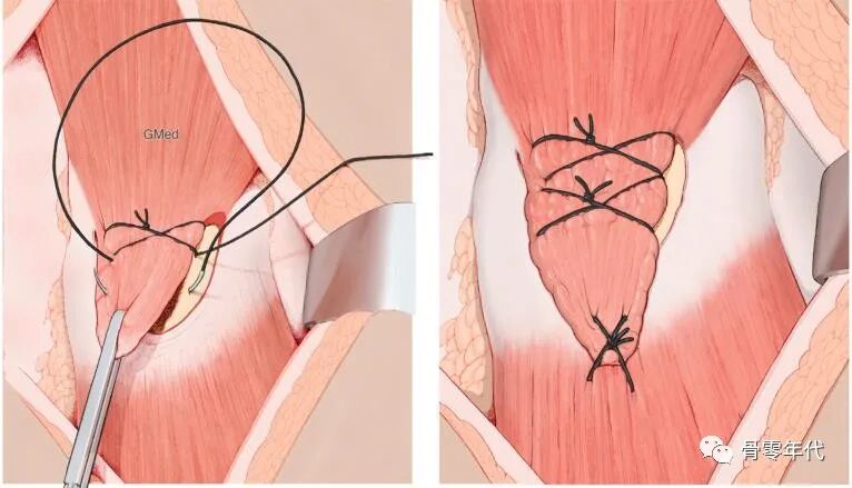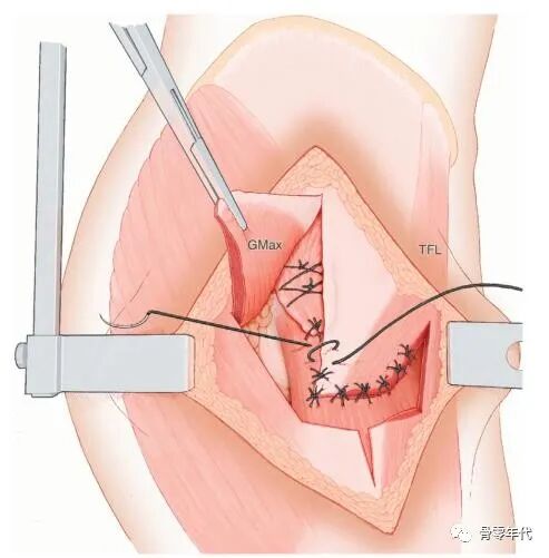 阔筋膜张肌远端转移到股外侧肌,同时在适当的张力下用多个中断的不可吸收的8字形缝合线固定。或者(没有在图中显示),如果不能动员外展肌进行直接修复,可以使用第1步中描述的骨隧道来固定阔筋膜张肌滑移。