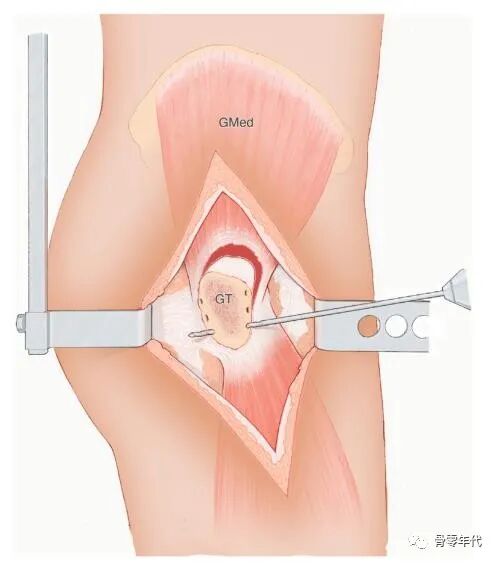 附着在股骨大转子上的任何臀中肌纤维都被保留。在臀中肌纤维被撕下的地方,用摆动锯对股骨大转子的外侧关节面进行打磨。用2.5 mm的钻头从前向后钻出三个经骨缝合隧道。