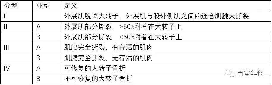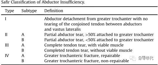 使用Safir外展肌功能不全分类系统对外展肌功能不足的程度进行分类。对IIB级、IIIA/B级和IVB级撕裂进行外展肌重建。这包括部分外展肌腱撕裂,外展肌腱残留率低于50%(IIB),完全外展肌腱撕裂伴或不伴外展肌存活,以及大转子处不可修复的骨折/骨丢失(IVB)。