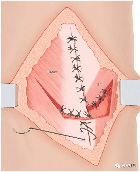 将臀大肌移位于的阔筋膜张肌上方前方,远端用多次间断的不可吸收的八字缝线与阔筋膜张肌、股外侧肌缝合。阔筋膜远端解剖闭合,皮下组织和皮肤分层闭合。