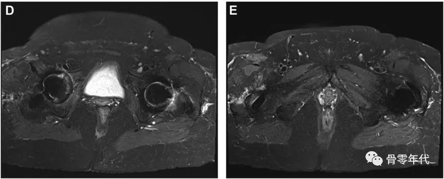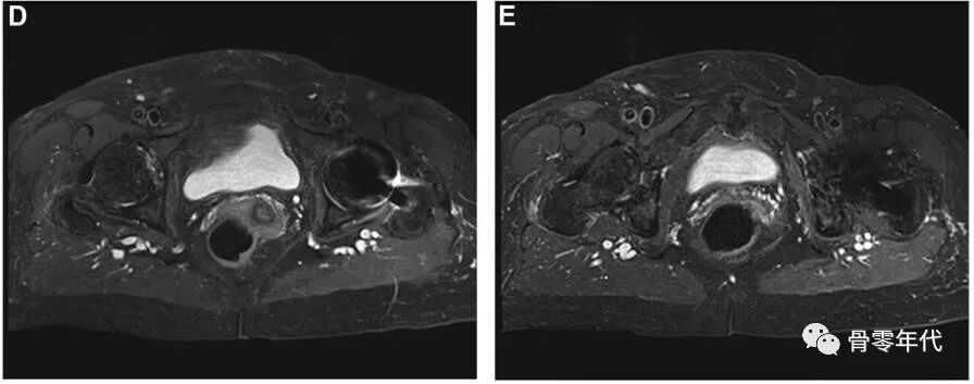 (A-C)术前X光显示大转子有轻微骨折,和先前植入的右全髋关节假体,包括非骨水泥的股骨柄和非骨水泥的髋臼假体。(D和E)在外展肌重建前进行的MRI图像显示臀中肌腱仍然附着在大转子骨折片段上。这块骨折碎片已经移位,近端移位。臀小肌腱终止于股骨近端的软组织。外展肌重建术后18个月的报告包括:休息疼痛,3/10;行走疼痛,8/10;Harris髋关节评分,26;牛津髋关节评分,37。患者报告中度跛行,行走时使用助行器。