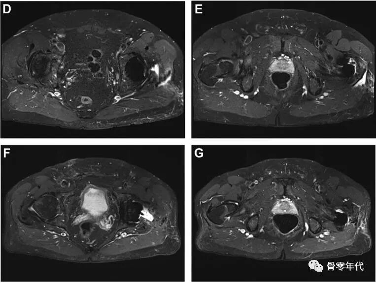 (A-C)术前X光显示左侧股骨近端骨量减少,翻修时预先放置的模块化骨干接合股骨柄用于假体周围骨折的治疗。(D和E)在外展肌重建前进行的MRI图像显示臀中肌和小肌脂肪萎缩,股骨肌腱附着处改变。(F和G)外展肌重建18个月后的部分MRI图像显示臀中肌附着完整,臀小肌部分连续。患者报告的外展肌重建术23个月的结果包括:静息疼痛,1/10;行走疼痛,3/10;Harris髋关节评分,61;牛津髋关节评分,22。患者报告中度跛行,仅需长时间步行时需要拐杖。