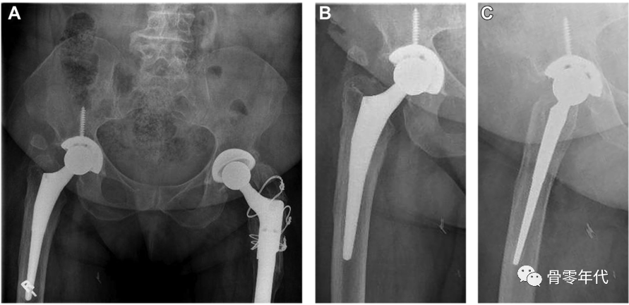 病例2:一位60岁女性主诉右髋部疼痛和外展肌无力,在初次右全髋关节置换术后出现大转子骨折。2/5 外展肌肌力。
