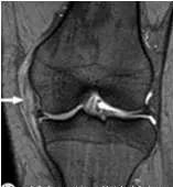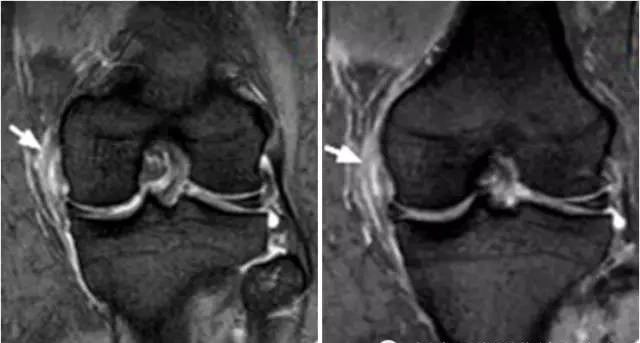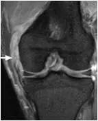 Ⅰ级:MCL 扭伤,可有水肿及出血;MRI 表现为损伤区T1WI 低信号,T2WI、STIR 呈高信号,在亚急性期出血时T1WI 可显示为高信号;而MCL的形态并不发生改变,与周围组织有明显的分界,冠状面上表现为平行于骨皮质的带状低信号影。