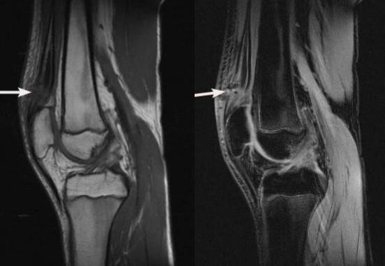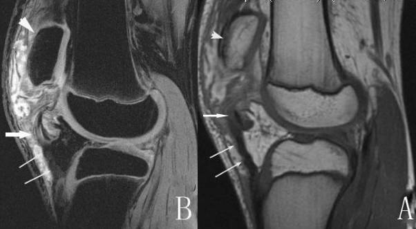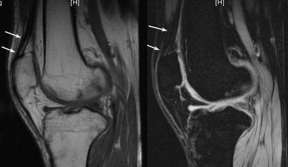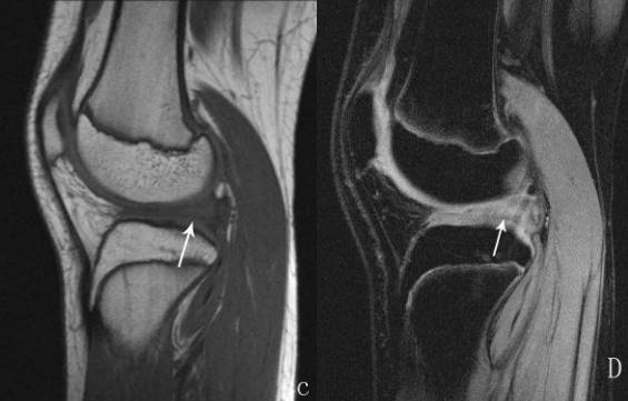 大多数撕裂发生在或靠近肌腱的髌骨上极插入部。部分撕裂表现为肌腱任意层的中断,常类及股直肌部分。全层撕裂表现为肌腱的完全断裂和局部水肿、出血引起的肿块,在T2和IR序列图像上表现为高信号。完全撕裂时多数可见因为肌肉收缩引起的肌腱末端退缩,髌骨的位置可下移。