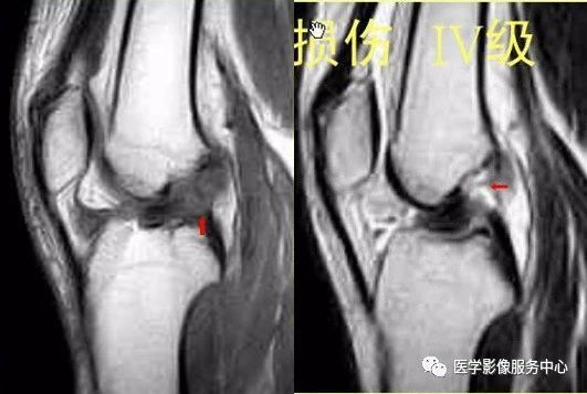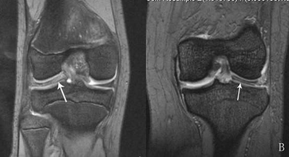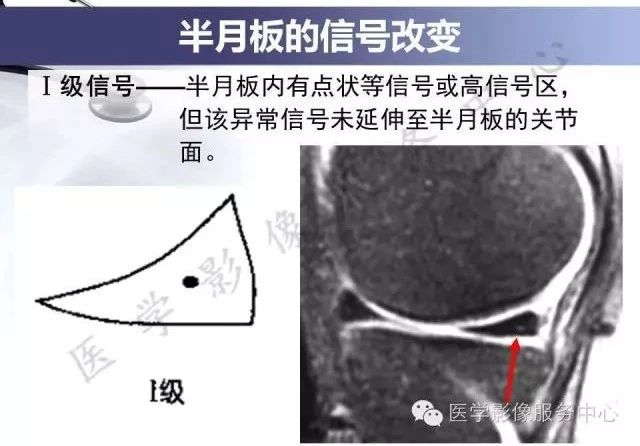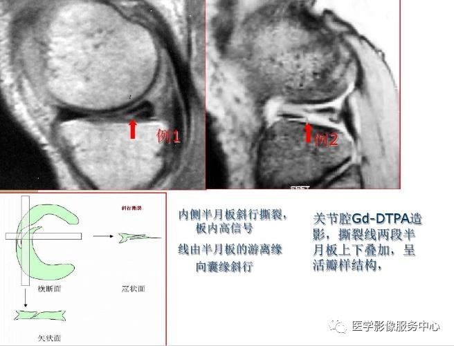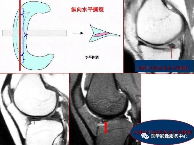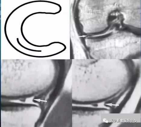 MRI 示Ⅲ级高信号影的方向与胫骨平台平行, 内缘达半月板的游离缘,较少见,常与半月板囊肿同时出现;