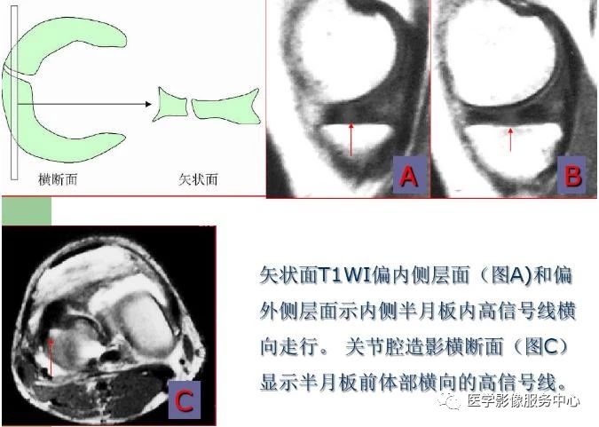 MRI 示其高信号的方向与半月板的长轴方向垂直