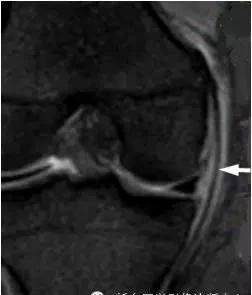 Ⅱ级:MCL 部分撕裂;Ⅱ级损伤,因韧带部分撕裂,水肿和出血使韧带和周围组织分界不清,其韧带可有移位,不再平行于骨皮质缘,部分纤维断裂处在T2WI 或STIR 上呈高信号。