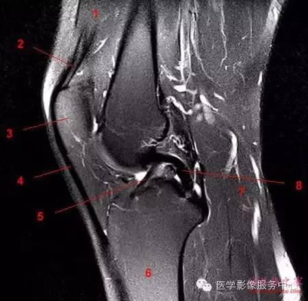 1、股内侧肌。2、股四头肌肌腱。3、髌骨。4、髌韧带。5、前交叉韧带。6、胫骨。7、腓肠肌内侧头。8、后交叉韧带。