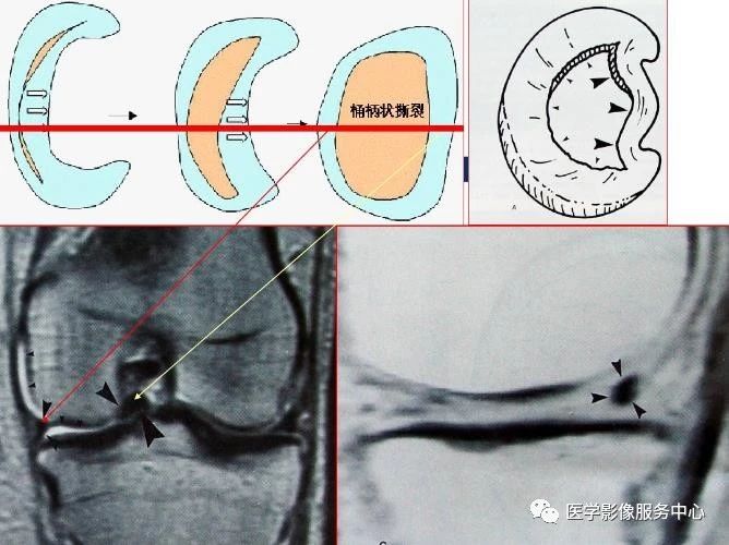 为纵形撕裂伴碎片向内侧移位,这种移位的片段类似于桶的柄,该型撕裂几乎累及半月板的所有部位,常易漏诊,在 MRI 上可以有多种表现,主要为半月板的宽度减小,在通过半月板体部的冠状面上未见到与对侧半月板共同构成的蝶形表现,同时可见到内移的半月板碎片位于髁间窝或交叉韧带旁,可形成双前、后交叉韧带征,这一征象在诊断半月板桶柄状撕裂中有重要意义;