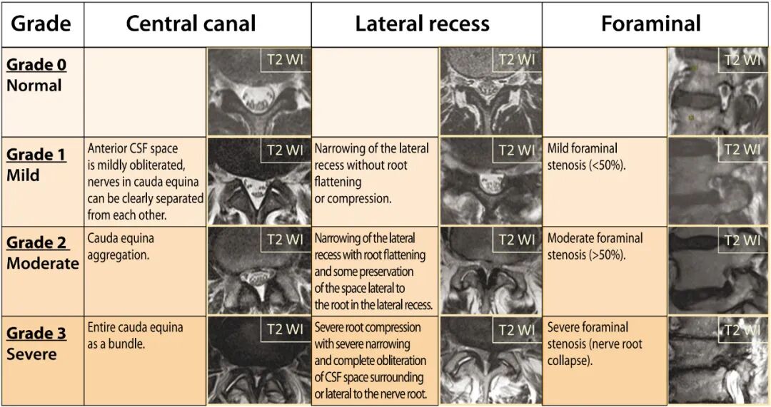 腰椎中央椎管、侧隐窝和椎间孔区狭窄的严重程度分级