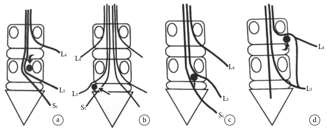 b. L5-S1椎间盘突出向外侧移位压迫L5和S1根;