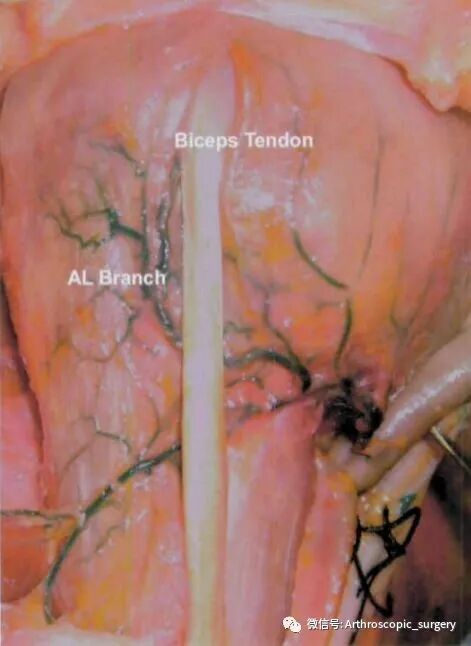 旋肱前动脉(anterior humeral circumflex artery)在前面紧密地贴着肱骨头,AL Branch (anterolateral branch of the anterior humeral circumflex artery):旋肱前动脉的前外侧分支,也就是前面的分支5。