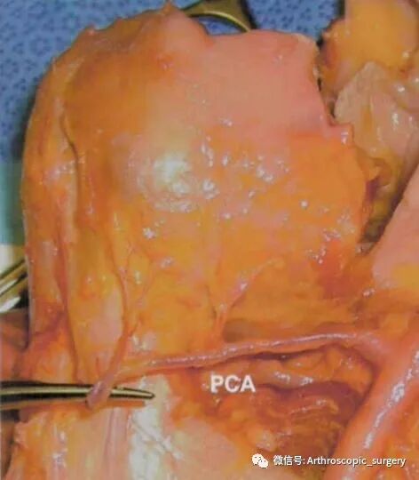 旋肱后动脉(posterior humeral ciroumflex artery (PCA))环绕肱骨头后侧。注意:旋肱后动脉并不是紧密贴在肱骨头上的,而是通过几个滋养分支血管注入肱骨头。