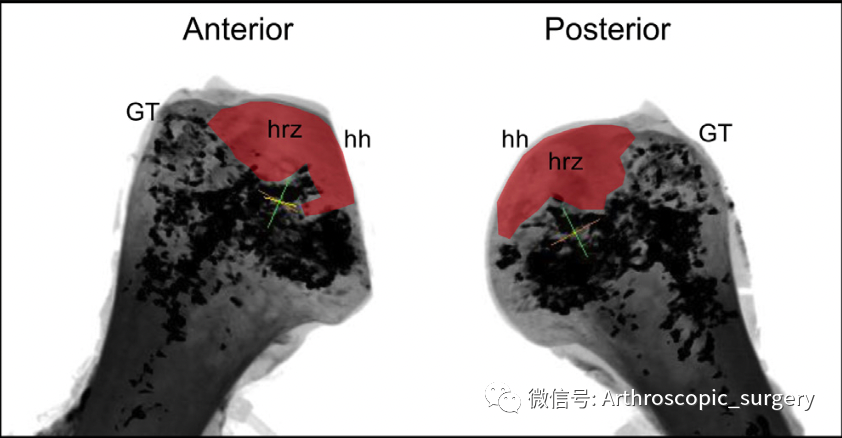 而通过微聚焦CT扫描可以发现肱骨头内血供的分布大致情况,大结节处血供相较而言比较差。肱骨头(hh);高风险区(the high-risk zone,hrz);肱骨大结节(GT)