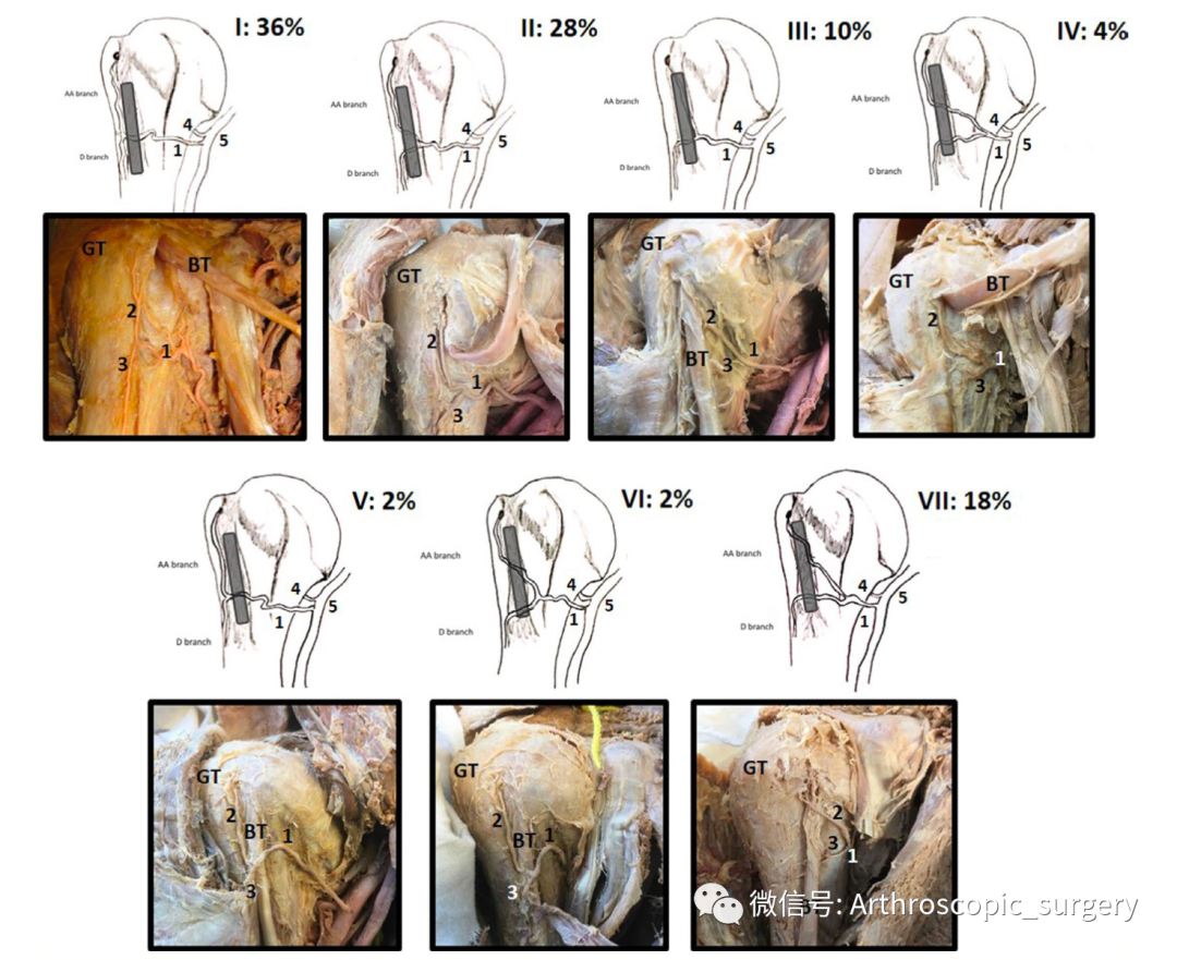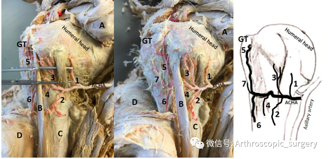 A(喙突);B(肱二头肌长头腱);C(背阔肌肌腱);D(三角肌);GT(肱骨大结节);ACHC(旋肱前动脉);Humeral head(肱骨头);旋肱前动脉分成1-7,7个分支,1:分支营养肩关节下关节囊、肩胛下肌和肱骨小结节下部;2:内侧降支(营养背阔肌、肱二头肌长头腱下部);3:内侧升支(进入结节间沟内侧边缘);4:结节间沟支;5:前外侧分支(AA/AL: anterolateral branch);6:(侧)降支;7:横向分支