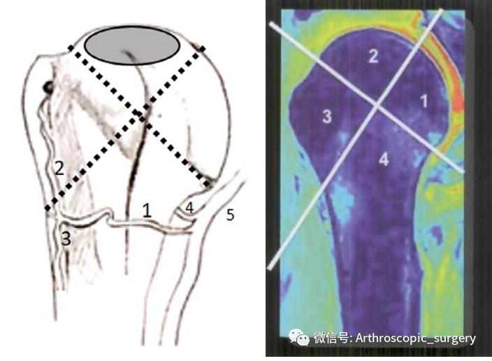 因此,有研究者根据肱骨头血供将肱骨头分成4个象限。右图(1:内侧象限;2:上象限;3:外侧象限;4:下象限。);左图(5:腋动脉;4:旋肱后动脉;1:旋肱前动脉;2:前外侧分支;3:降支)而灰色区域就是血供较差的区域。