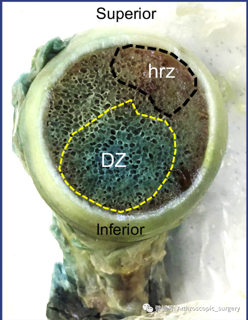 大体解剖剖面图,肱骨头下部区域的血液供应较为密集的区域(densely-supplied zone,DZ),高风险区(the high-risk zone,hrz)。