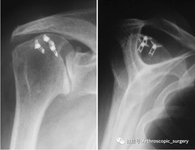 肱骨头坏死在肩关节镜术后相较而言比较少见,之前有关于肩关节脱位bankart修补术后出现骨坏死的报道,但是第一例明确提出因肩袖修补术后出现骨坏死的要追溯到2010年的文章,来自英国的Beauthier的报道了一名67岁老年女性肩袖术后出现持续性(8月)肩关节疼痛(下图)。