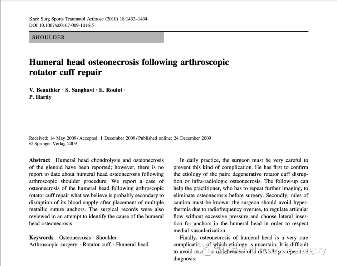 如果肩关节镜术后患者肩关节持续疼痛不适,保守治疗后仍然出现肩关节的持续疼痛不适,一定要患者做相应的影像学检查,排除术后肩关节的肱骨头坏死。如果你还没遇到,那请你一定要认真地阅读下面的文章,也许它能帮你和你的病人避免这样的风险!