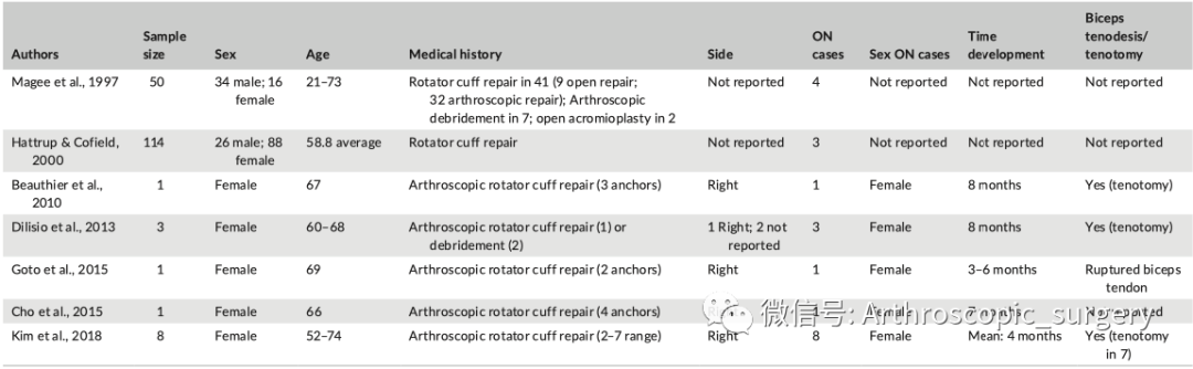 后面陆陆续续有不少的文章进行了相应的报道(下图),统计发现骨坏死多出现在术后4.8月、60岁以上、女性、优势手,在肩关节镜下肩袖修补的同时进行了额外的手术(如:二头肌长头腱的切段/固定、肩峰成形术、肩峰下减压等),但是究其原因暂时没有达成共识,但是大家更多的推测是因为手术中过多的操作导致相应血管的损伤,从而出现缺血性骨坏死。