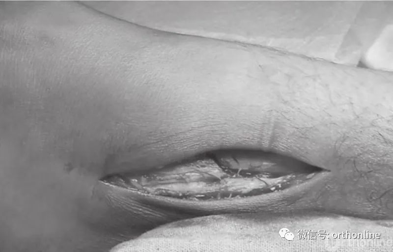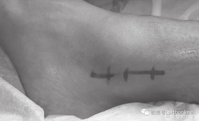 为避免神经瘤的形成,穿过腓骨远端的腓浅神经应得到保护。切开皮肤后,沿着切口线分开深筋膜(图3)。