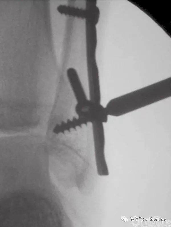当发生腓骨粉碎时,使用桥形接骨板,从而能绕过碎骨,皮质固定也可在骨折区域上下完成。在用螺钉固定前,应预先描出接骨板的轮廓。有时,如果在很低的位置发生横行骨折,可在踝部用4mm的张力性钢丝带加以固定。术中进行影像学检查,可以极为有效地避免远端的螺钉将关节刺穿(图9)。