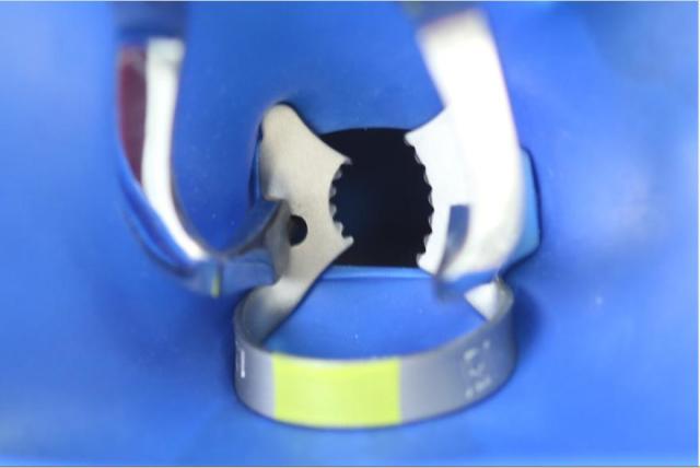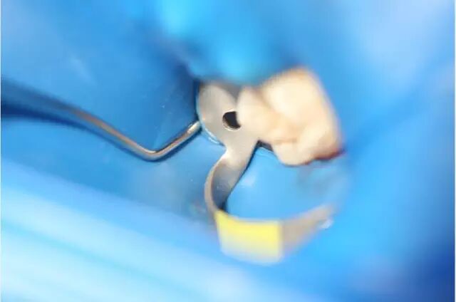 第三步:用橡皮障夹钳撑开橡皮障夹,口内就位后,再把橡皮障夹两侧翼的橡皮布用牙龈剥离器推向龈端。