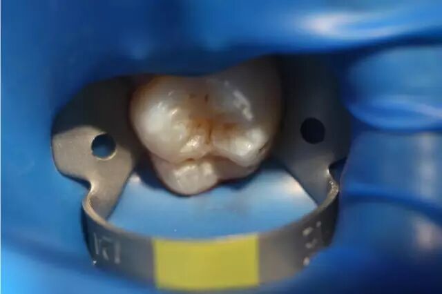 3、橡皮障夹应尽量避免安装在烤瓷冠或全瓷冠边缘以防止崩瓷,如不能避开,则可选用能伸到龈下的橡皮障夹。