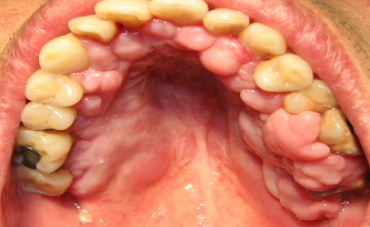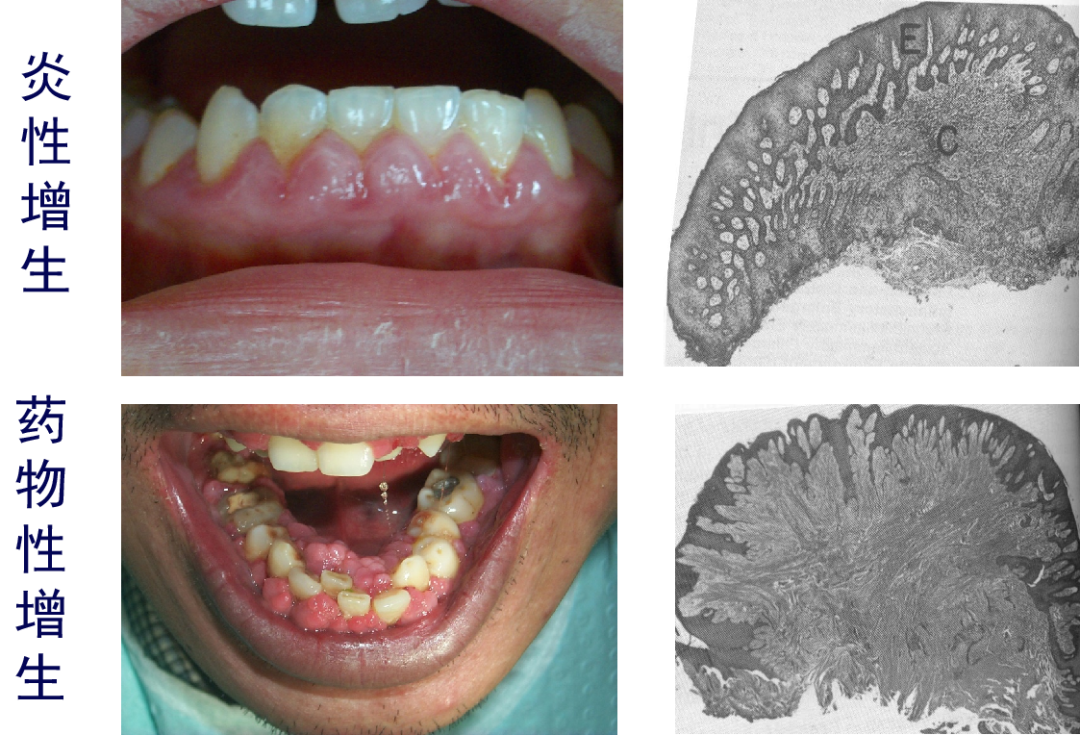 牙龈纤维性增生:牙龈坚韧肥大,因为袋的外侧壁有明显的纤维性修复,但袋内壁仍存在炎性改变。