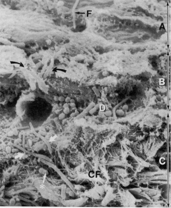 牙周袋断面(SEM):严重牙周炎牙周袋断面可见细菌穿过上皮和结缔组织;A,牙周袋内壁,B上皮断层。C结缔组织断层;弯箭头为细菌正在穿过上皮;白箭头为细菌正通过破坏的不连续的基底膜进入CT,CF结缔组织纤维;D聚集的细菌(杆,球,丝等菌);*为球杆菌在CT中;