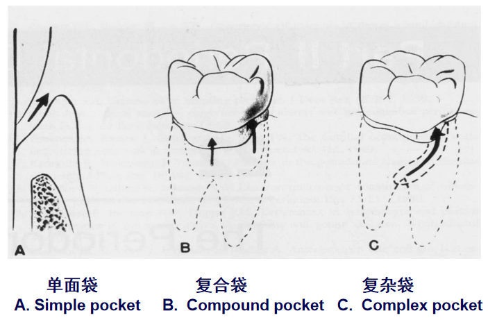 牙周袋:是病理性加深的龈沟,是牙周炎最重要的病理改变之一。牙龈炎时,牙龈的肿胀或增生使龈缘位置向牙冠方向移动,结合上皮位置未向根方迁移,此为假性牙周袋,或称龈袋。牙周炎时,结合上皮向根方增殖,其冠方部分与牙面分离形成牙周袋,这是真性牙周袋。
