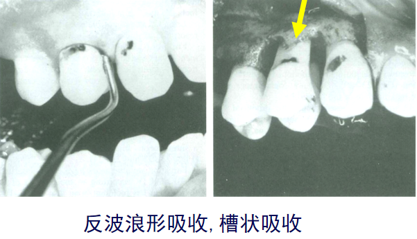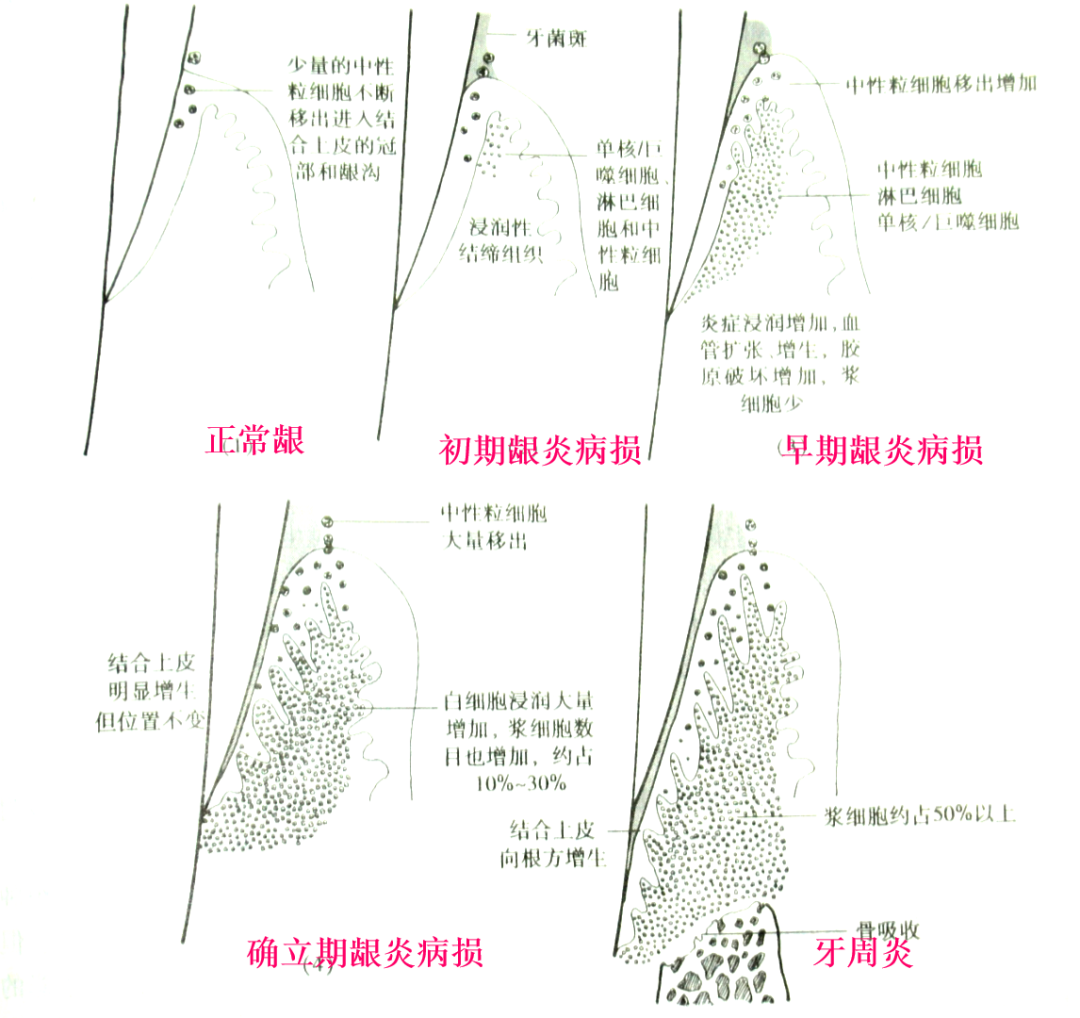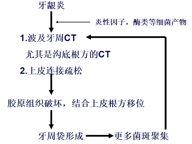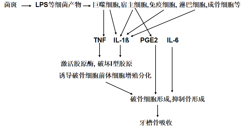 炎性浸润破坏胶原纤维向深部牙槽嵴延伸,引起牙槽骨吸收