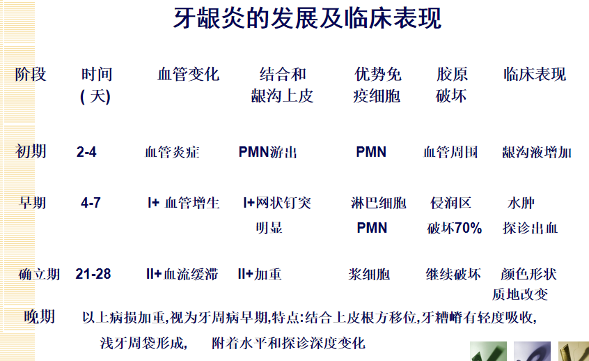 - 牙周袋内含有菌斑、软垢、龈沟液、食物碎渣、唾液粘蛋白、脱落上皮和白细胞等,白细胞坏死分解后形成脓液;