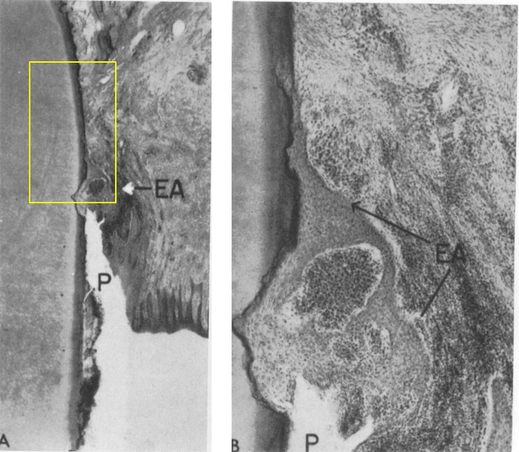 A的放大,可见结合上皮沿着吸收的根面,根方移位,上皮内可见大量炎症细胞