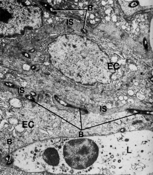 TEM牙周袋内壁上皮,可见细胞间隙间的细菌;B细菌,IS 细胞间隙;L白细胞将要吞噬细菌;